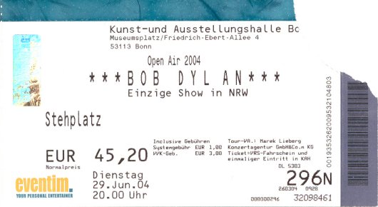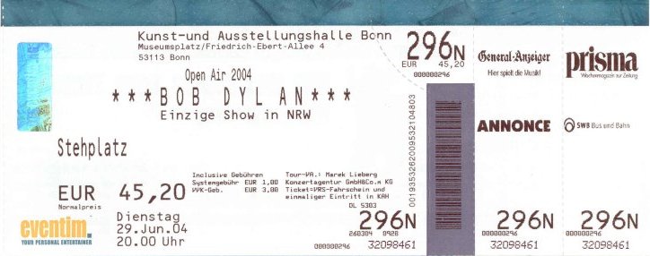 Bob Dylan concerts which the author has attended between 2001 & 2019. Bonn: June 29, 2004 ![]() Bonn: June 29, 2004 - untorn original - ![]() Worms: June 30, 2004 ![]() Worms: June 30, 2004 - untorn original - ![]() Ticket Stubs 2001 |