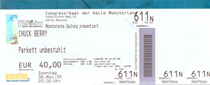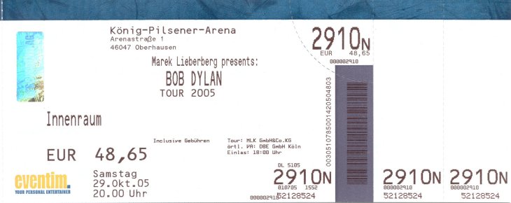 Bob Dylan concerts which the author has attended between 2001 & 2019. Oberhausen: October 29, 2005 Bob Dylan ![]() Oberhausen: October 29, 2005 Bob Dylan - untorn original - ![]() Münster: November 06, 2005 Chuck Berry ![]() Münster: November 06, 2005 Chuck Berry - untorn original - ![]() Ticket Stubs 2001 |