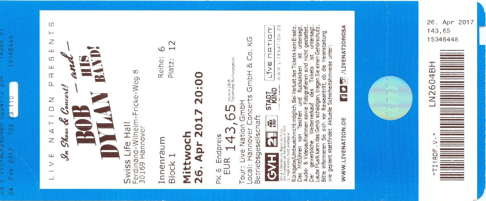 Bob Dylan concerts which the author has attended between 2001 & 2019. Barclaycard Arena Hamburg: April 11, 2017 Bob Dylan - untorn original - ![]() Emsland Arena Lingen (Ems): April 12, 2017 Bob Dylan - untorn original - ![]() Festhalle Frankfurt: April 25, 2017 Bob Dylan - eventim - ![]() Festhalle Frankfurt: April 25, 2017 Bob Dylan - ticketmaster - ![]() Swiss Life Hall Hannover: April 26, 2017 Bob Dylan - untorn original - ![]() Ticket Stubs 2001 |